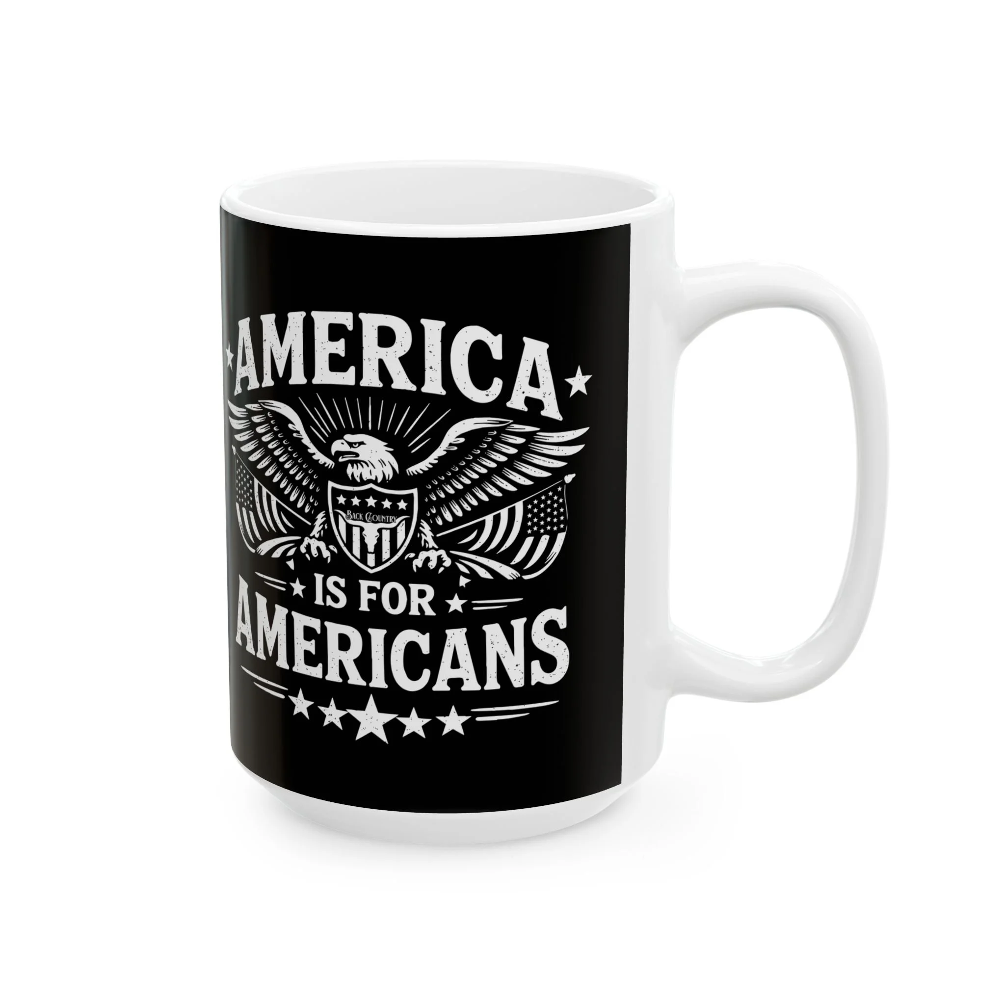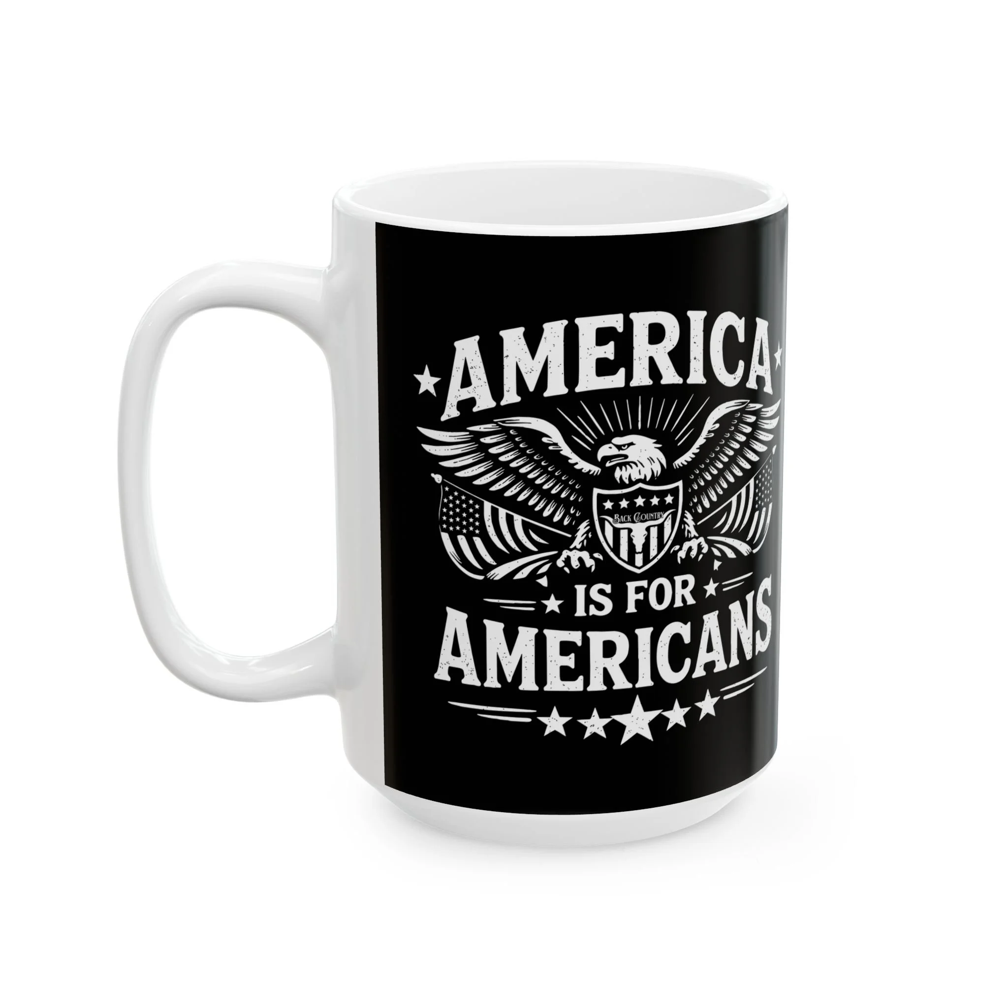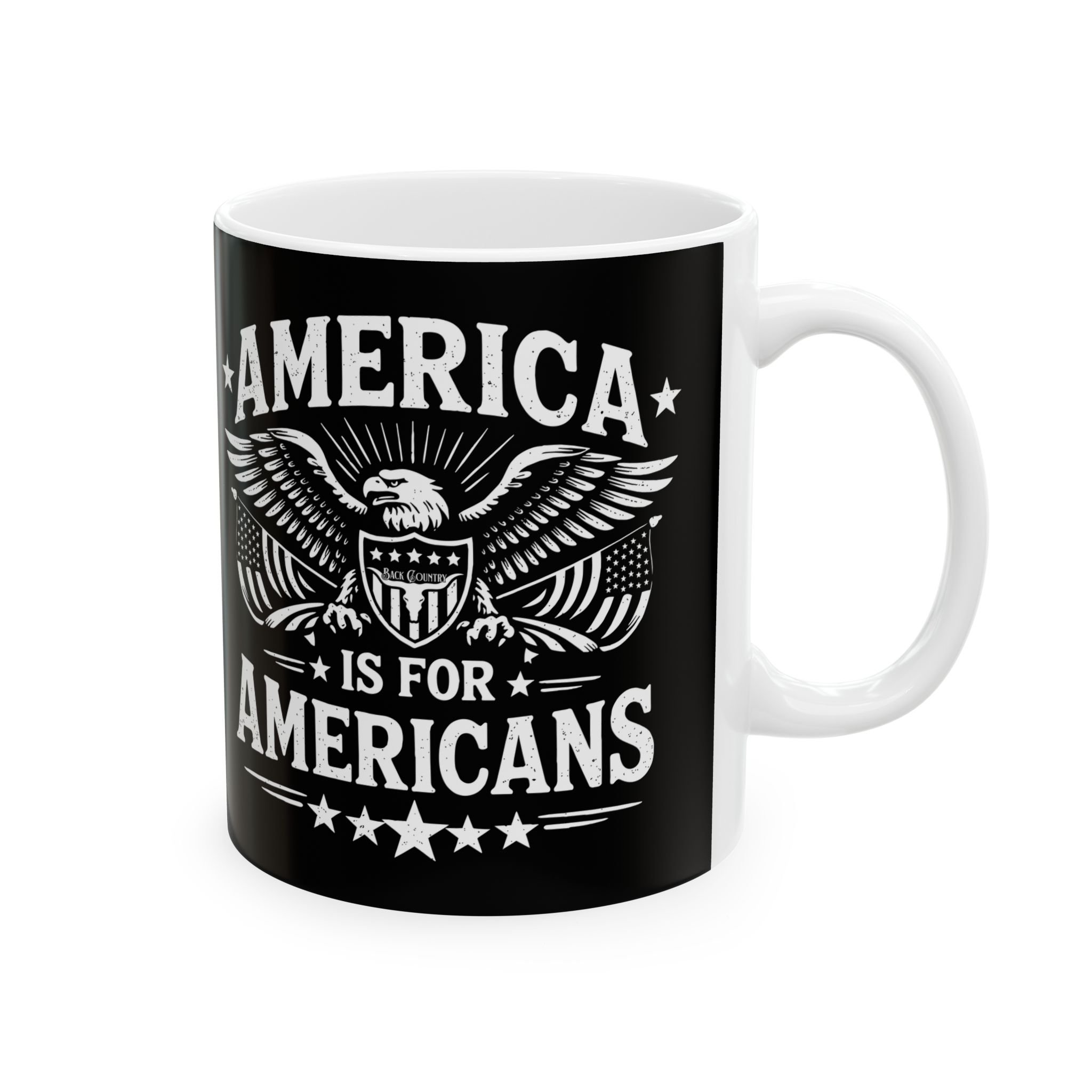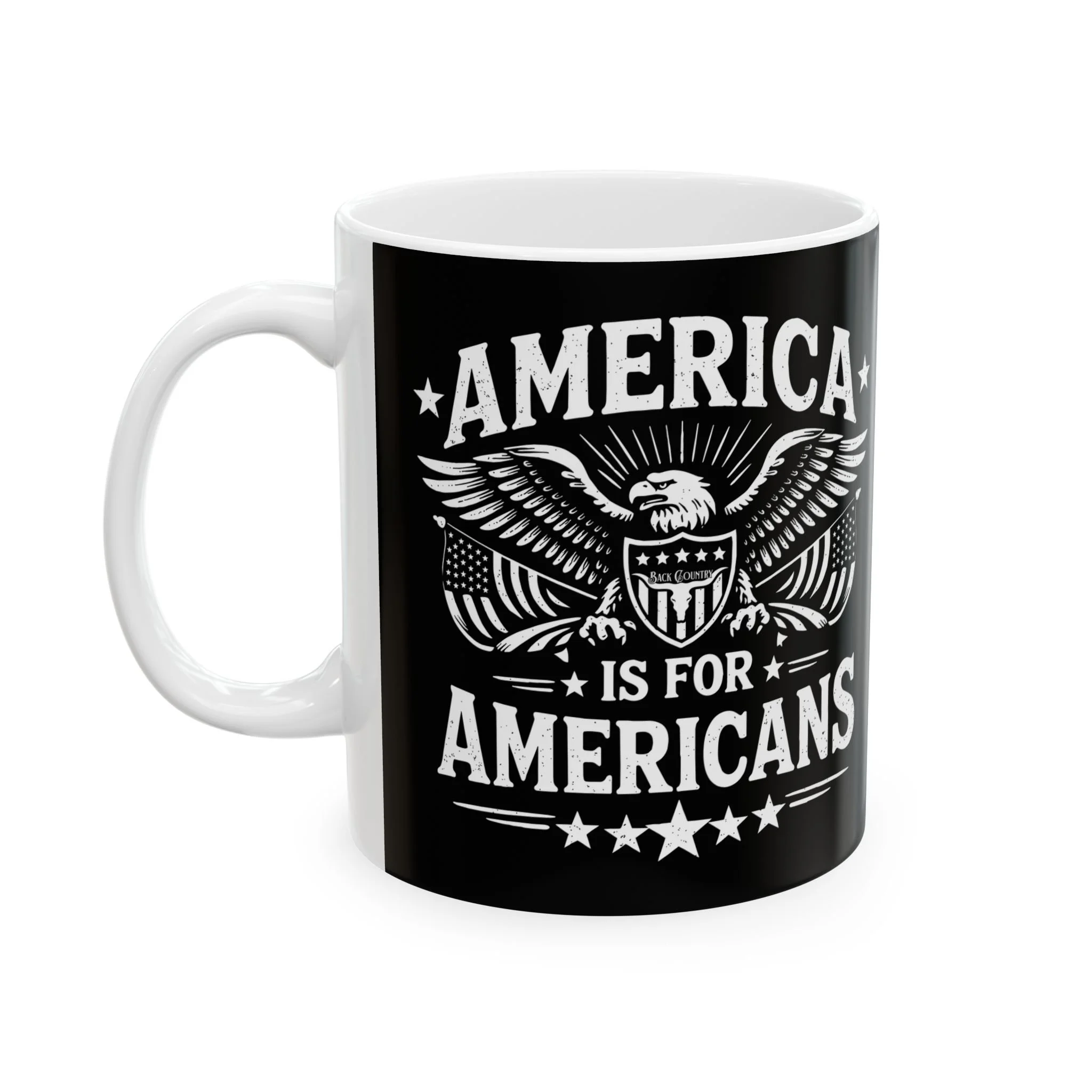 A sturdy ceramic mug with bold, high-contrast artwork that speaks to patriotic energy. The black background and crisp white illustration create a striking silhouette that stands out on a desk or kitchen counter. This mug holds a grounding morning coffee or a late-night brew while you plan, protest, or just think. Its comfortable C-handle and glossy finish make each sip tactile and satisfying. Built for daily use and printed with vibrant, durable inks, this piece feels like a small emblem of conviction — a quiet reminder of voice and purpose with every drink.