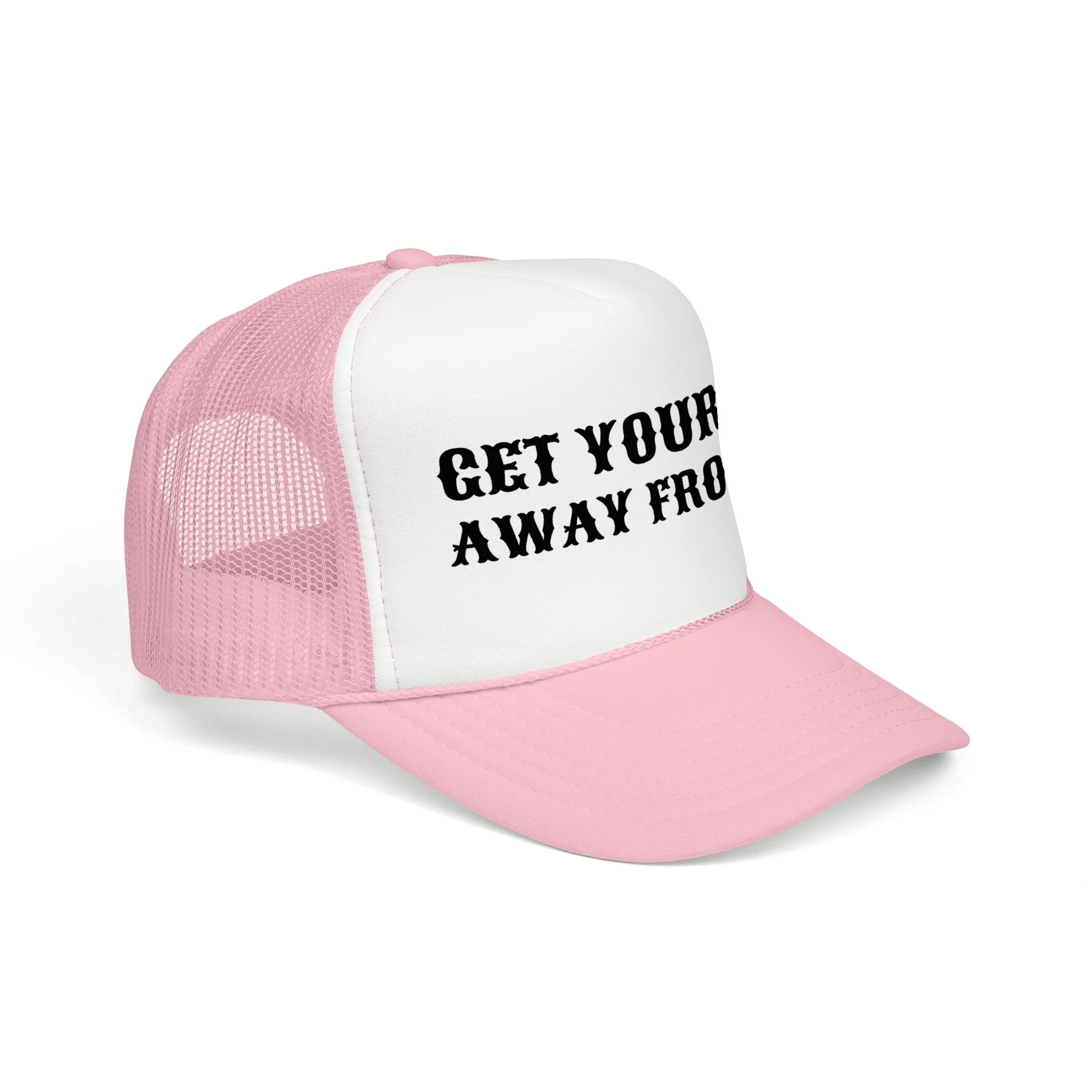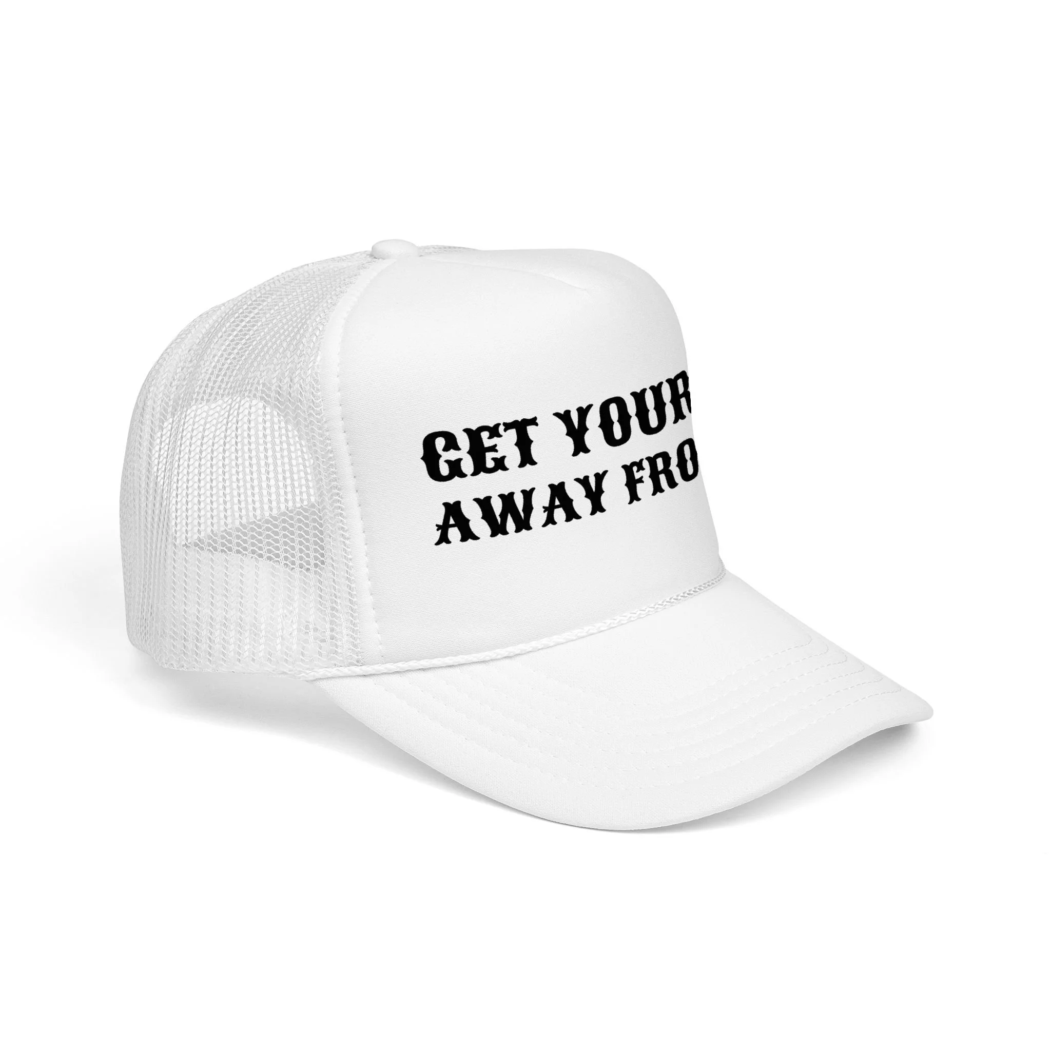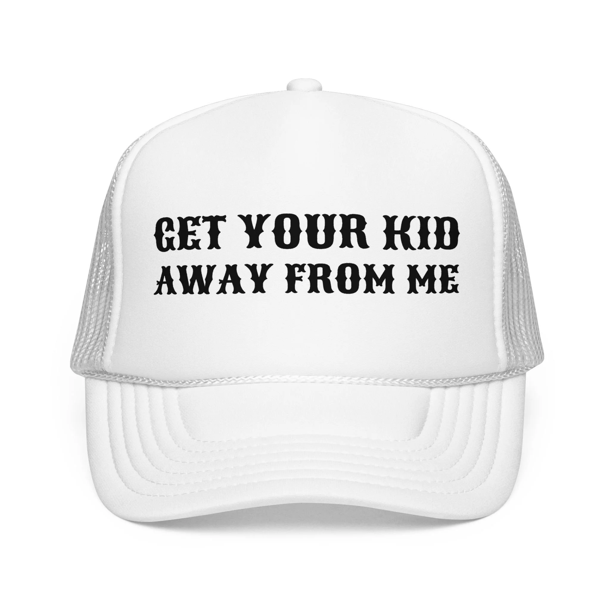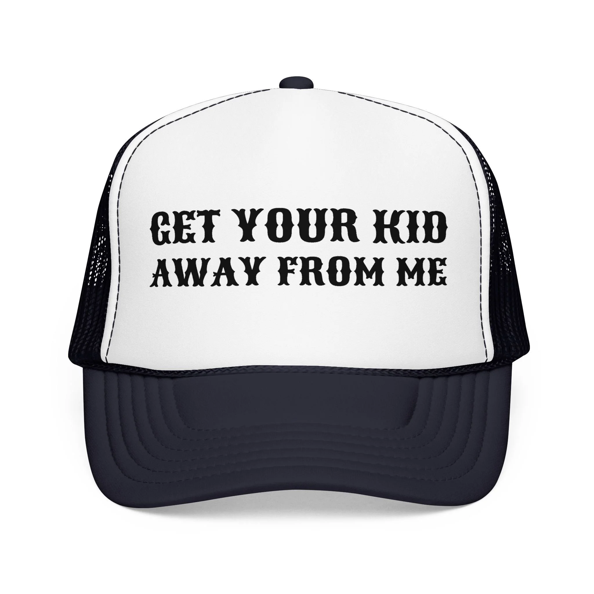 This foam trucker hat carries a sassy, boundary-setting message with bold stencil lettering across a clean white foam front and contrasting black mesh back. It sits high and structured on the head, giving the phrase a confident presence whether you’re running errands, walking the dog, or keeping an eye on rowdy playground scenes. The pre-curved visor and matching undervisor keep sun glare down while the breathable mesh back and adjustable snap make it easy to wear for long afternoons outdoors. It’s for people who prize straightforward humor and a little attitude — worn as a personal statement that keeps conversations light and boundaries clear.