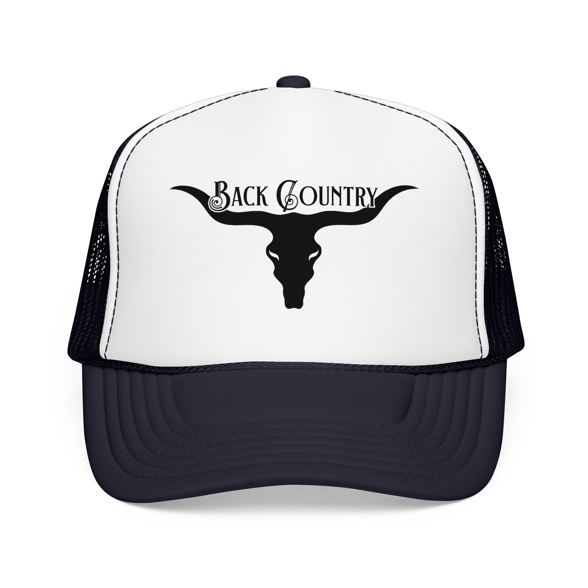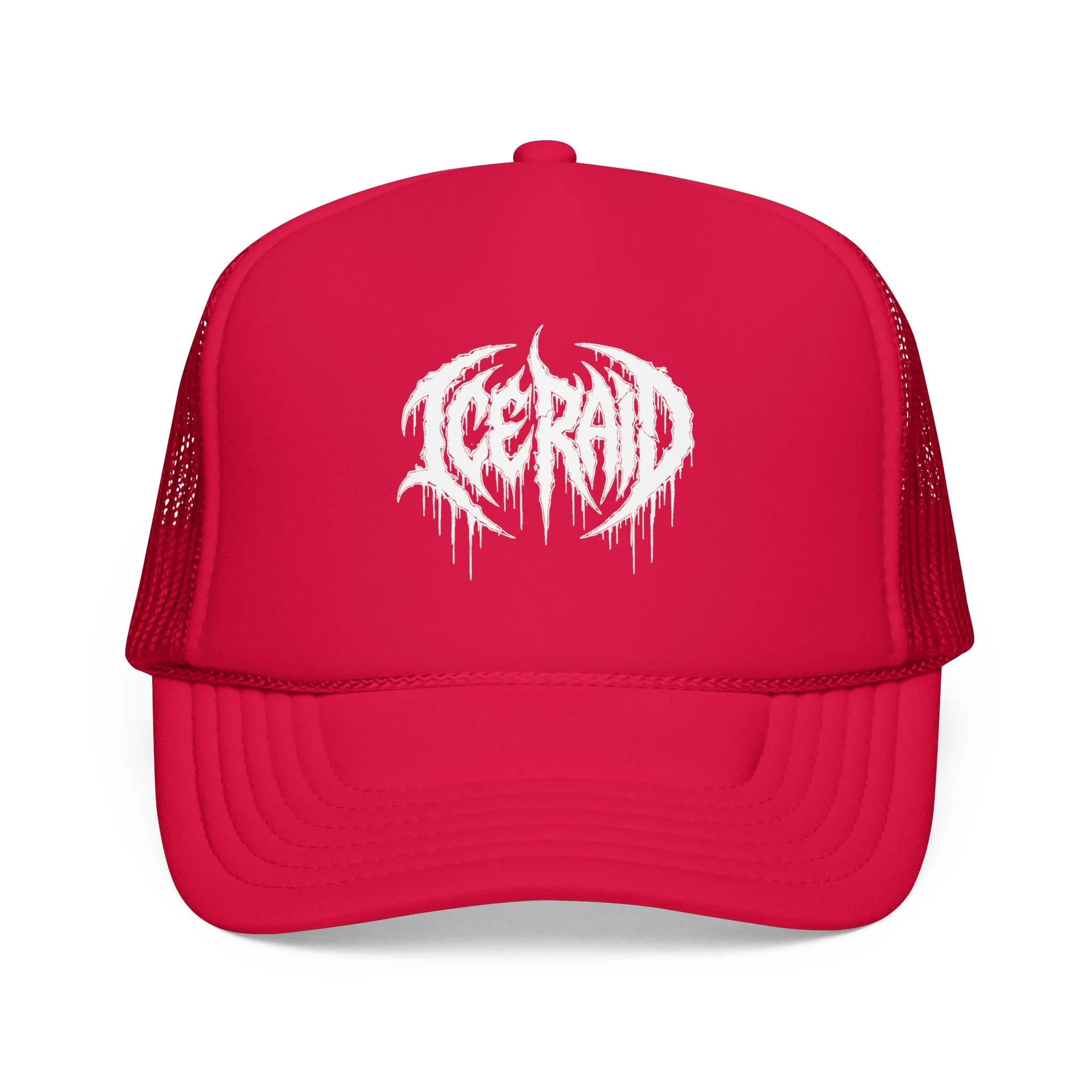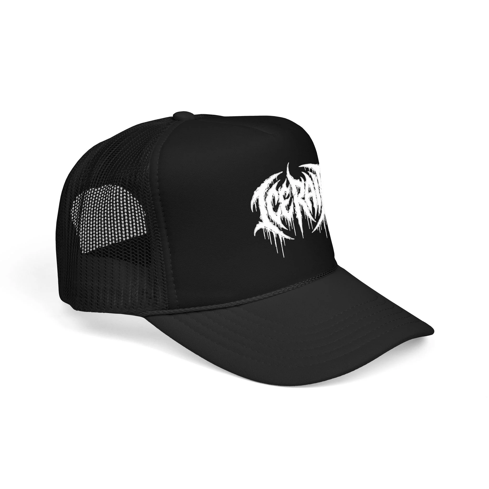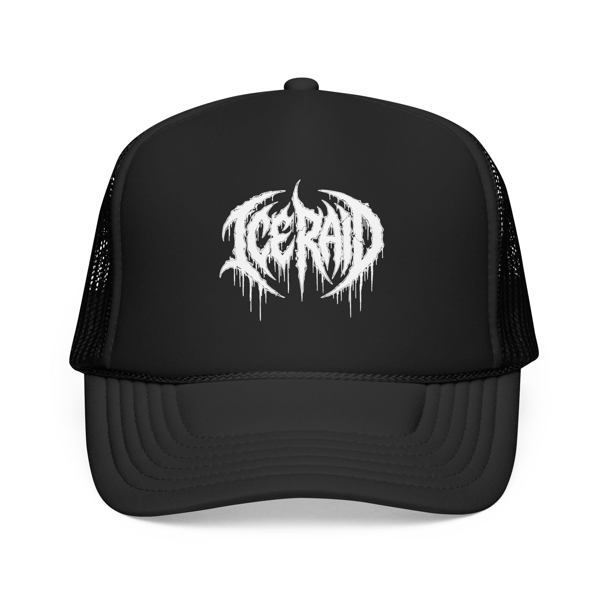 A rugged foam trucker hat that channels underground music energy and late-night jam sessions. The high-profile structured front holds a seamless foam panel where a distressed, dripping logo sits in stark white against black — bold without shouting. Breathable mesh keeps the back cool during long sets or summer shows. The pre-curved visor and adjustable snap let you dial the fit and tilt for stage-ready attitude or laid-back streetwear.