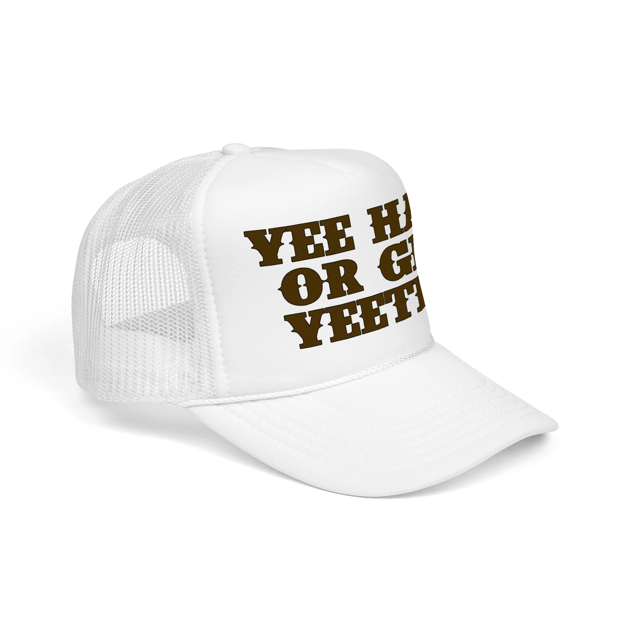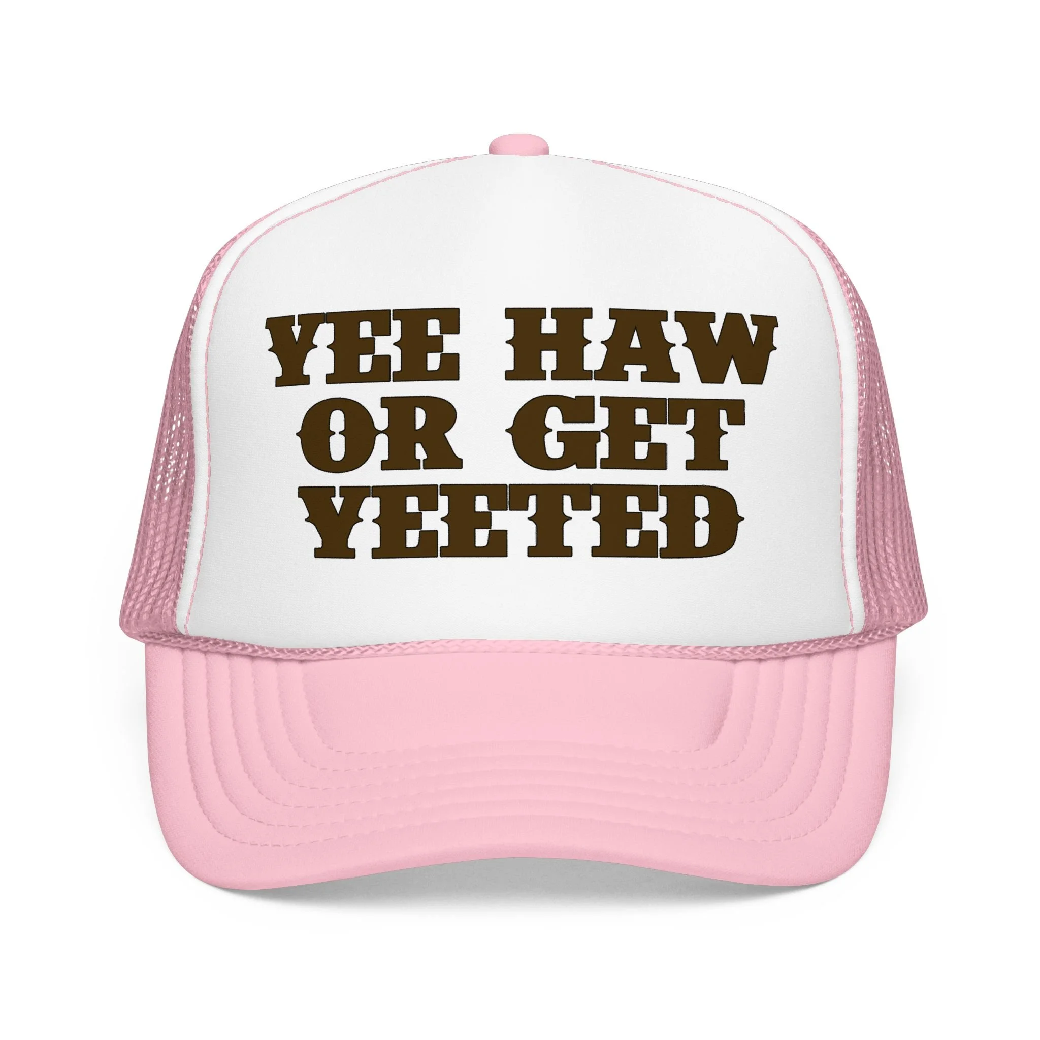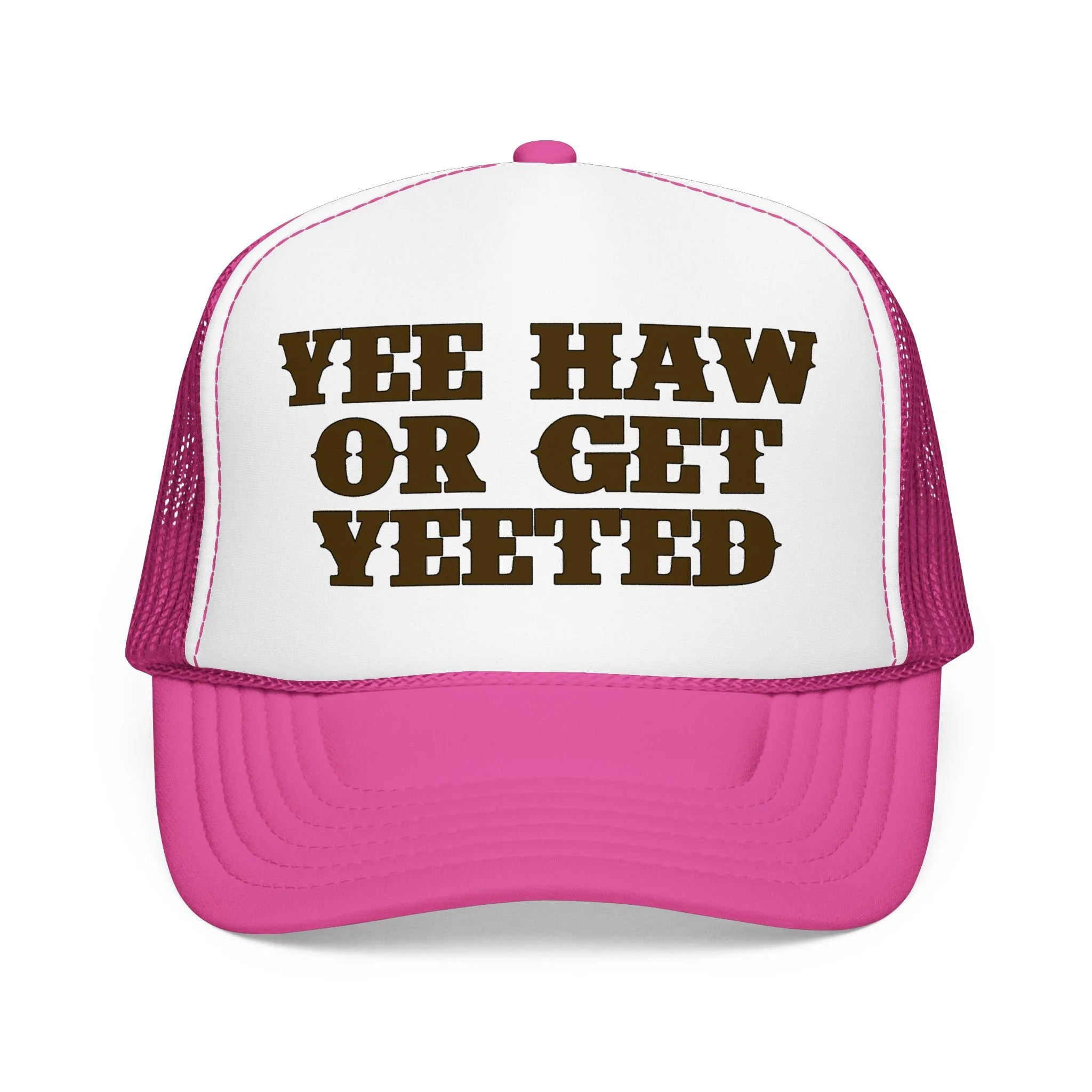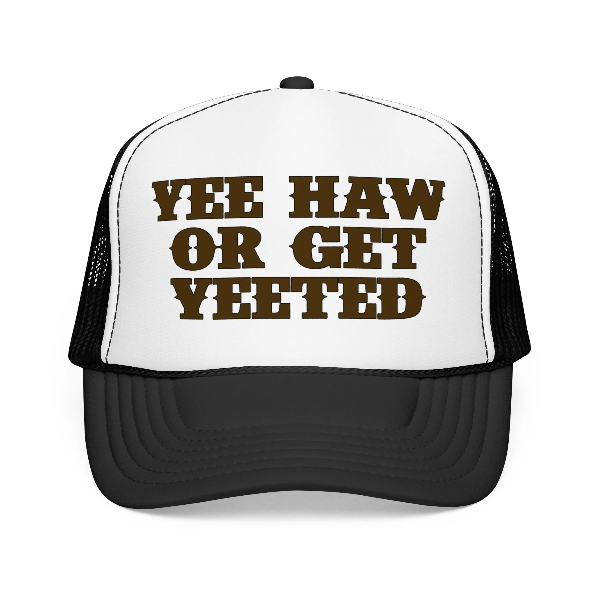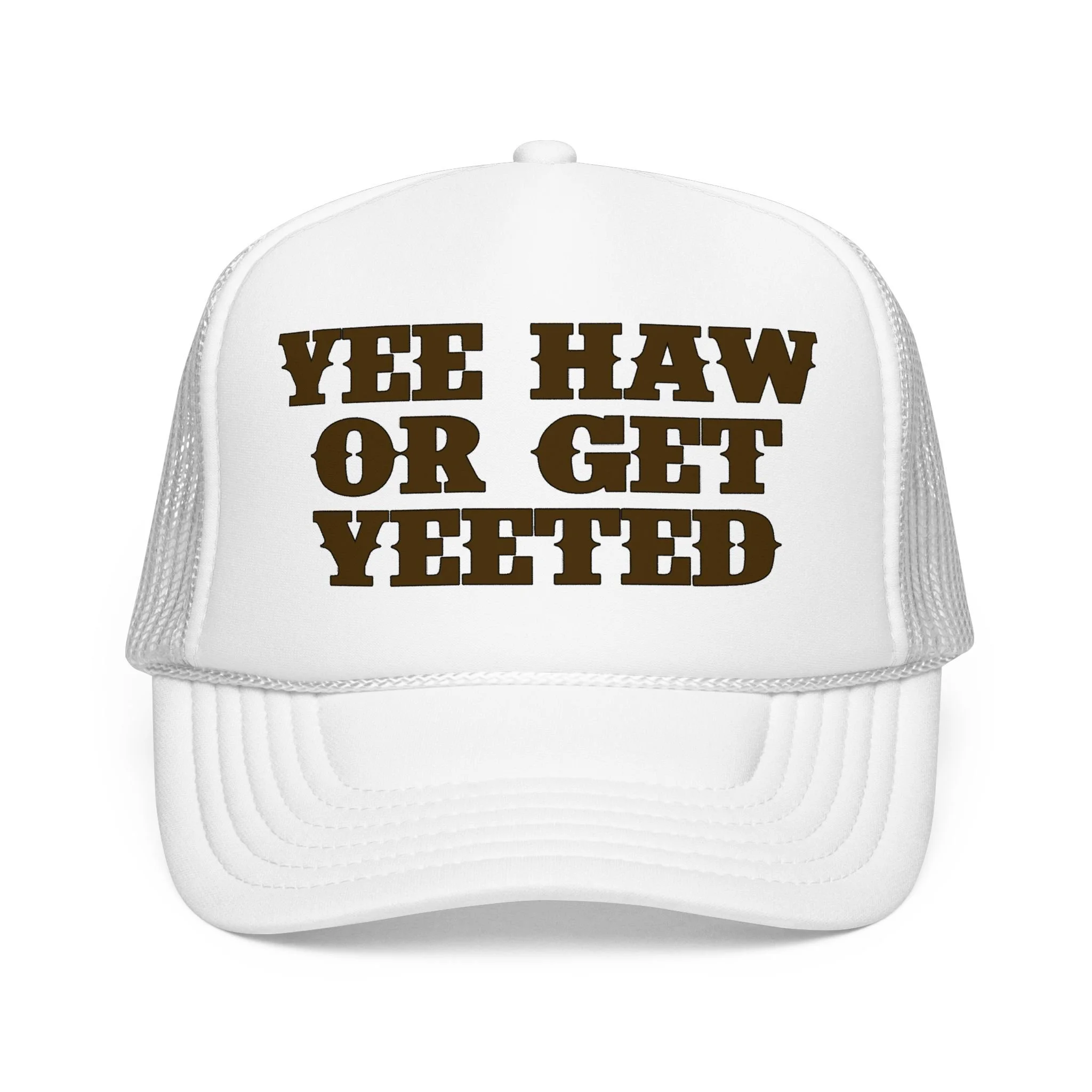 This foam trucker hat brings loud, playful attitude to your everyday wear. The high-profile, seamless foam front carries bold brown lettering that reads “YEE HAW OR GET YEETED,” making a cheeky statement whether you’re at a country show, a backyard bonfire, or cruising town on a sunny day. The structured five-panel build and laminated foam front keep the print crisp and upright, while the breathable mesh back and adjustable snap let you wear it all day without overheating. It’s a hat that leans into farm-to-festival energy — rowdy, lighthearted, and ready to be tossed on whenever you want to add a little mischief to your look.