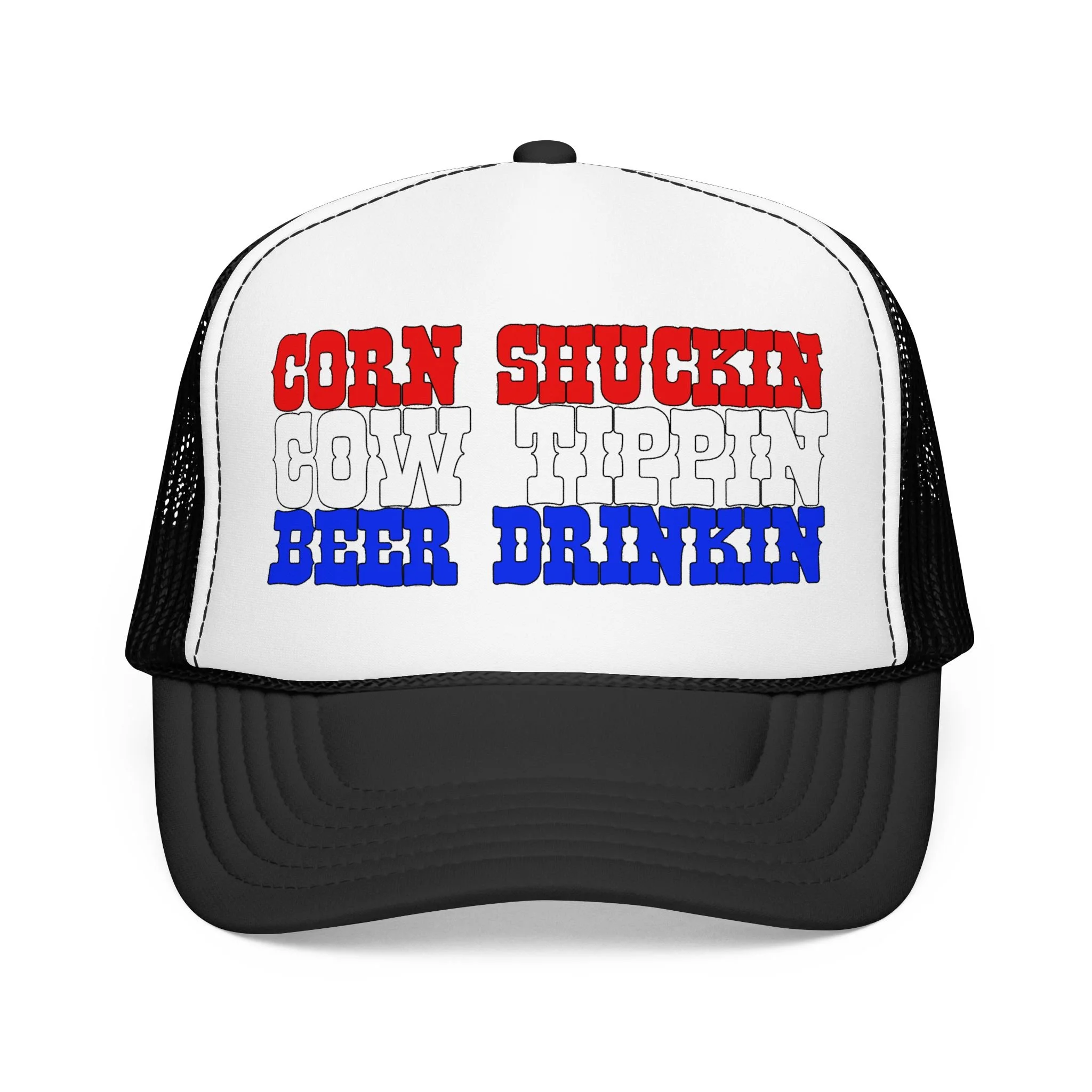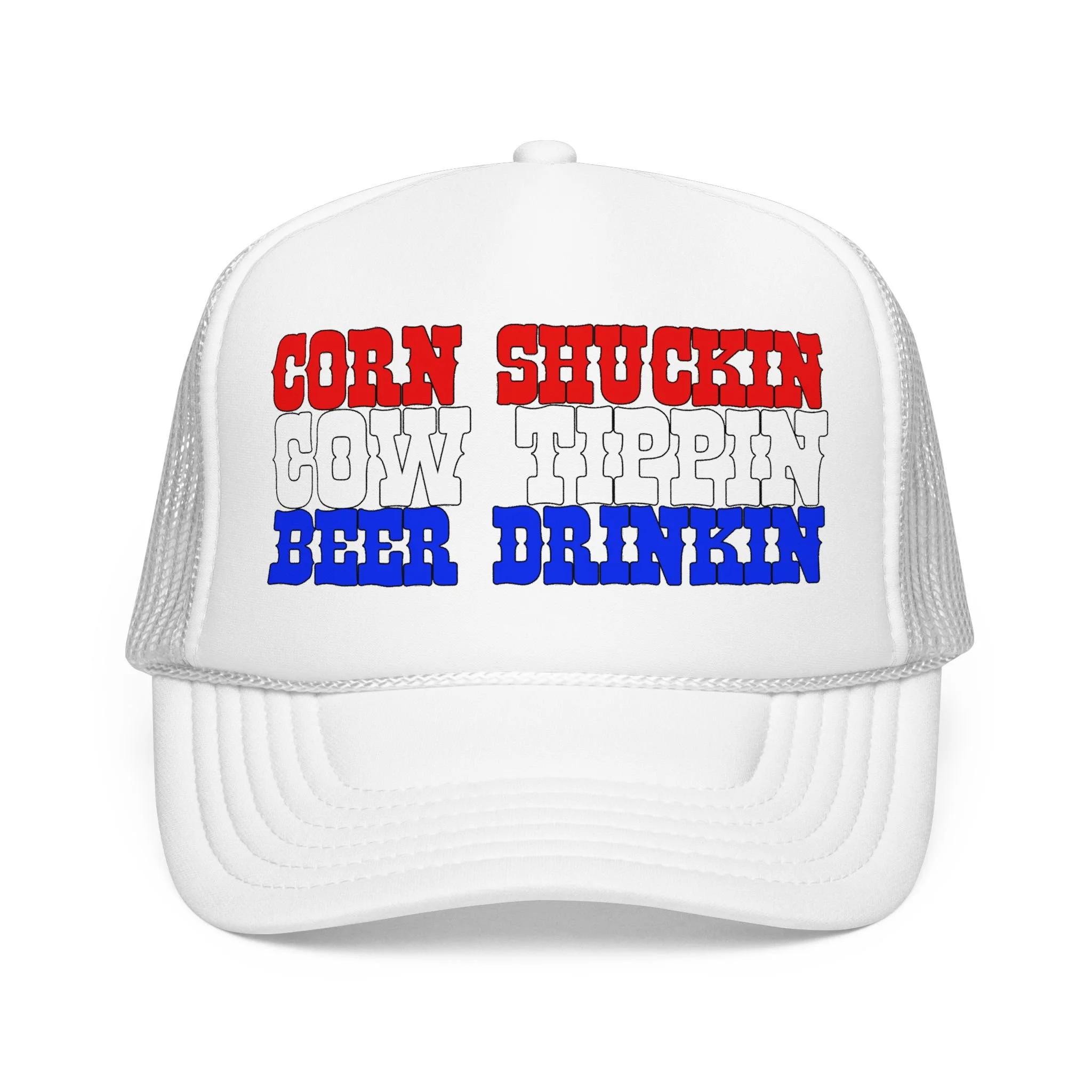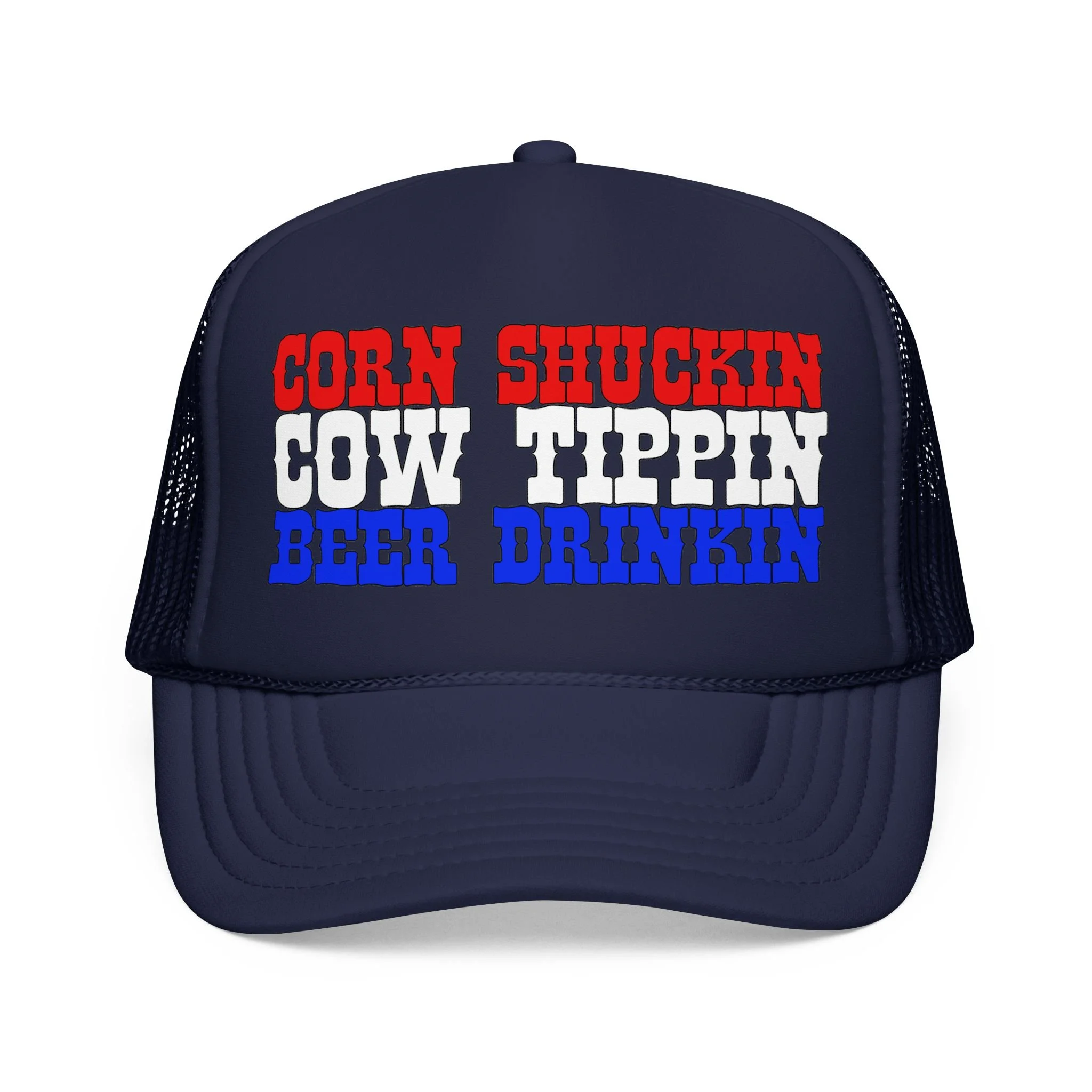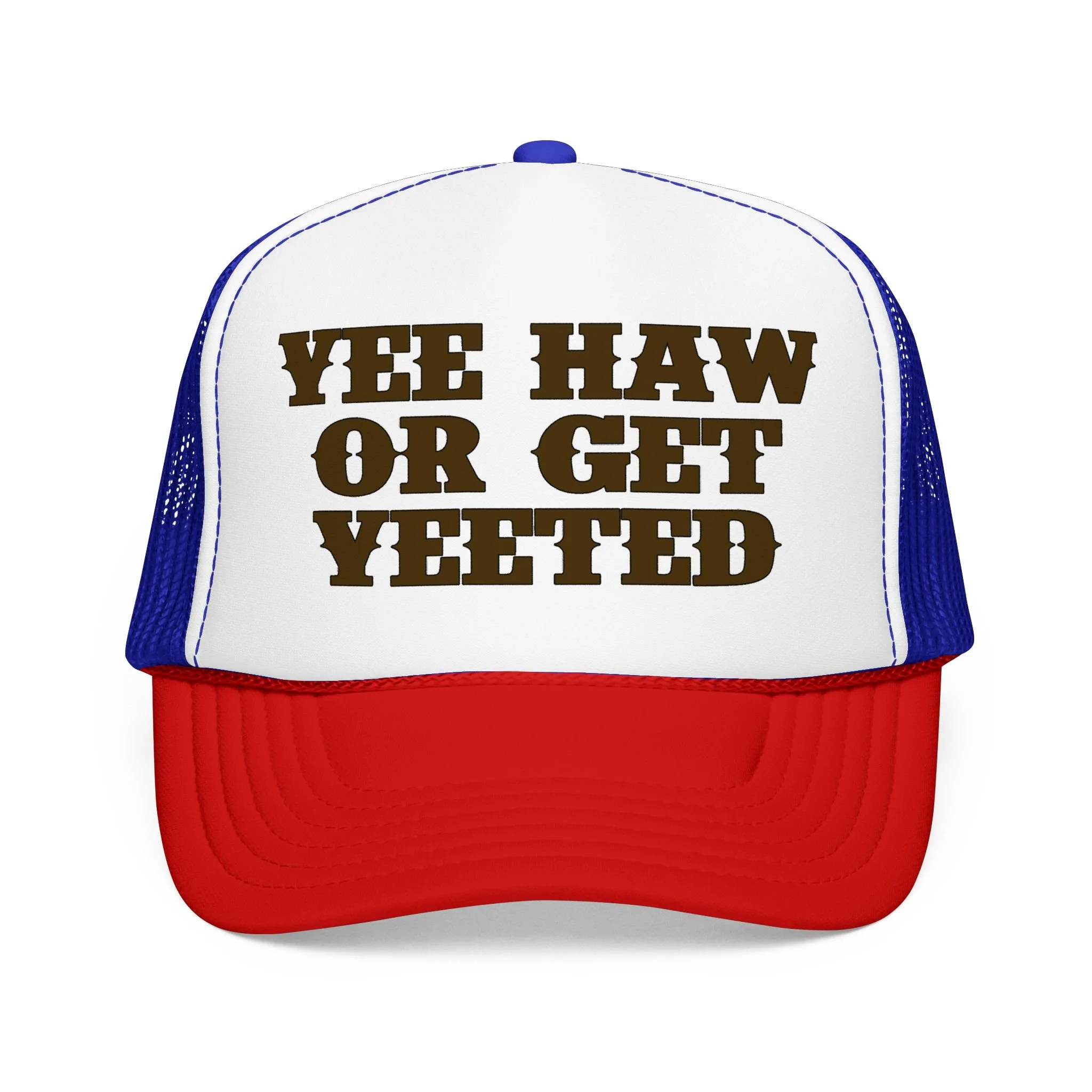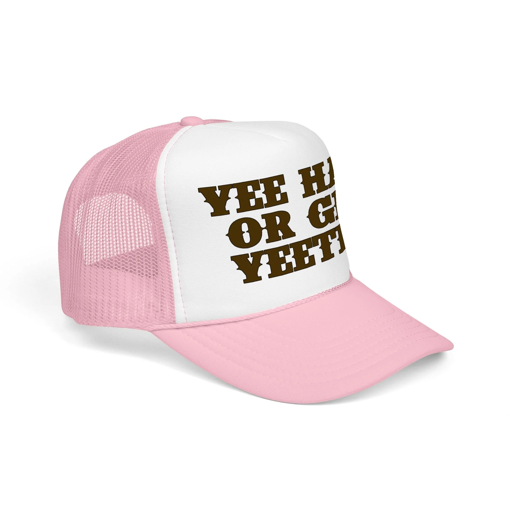 This foam trucker hat brings loud, playful attitude to your everyday wear. The high-profile, seamless foam front carries bold brown lettering that reads “YEE HAW OR GET YEETED,” making a cheeky statement whether you’re at a country show, a backyard bonfire, or cruising town on a sunny day. The structured five-panel build and laminated foam front keep the print crisp and upright, while the breathable mesh back and adjustable snap let you wear it all day without overheating. It’s a hat that leans into farm-to-festival energy — rowdy, lighthearted, and ready to be tossed on whenever you want to add a little mischief to your look.